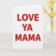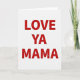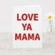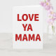 This greeting card centers on the words “LOVE YA MAMA” stacked in three lines right in the middle. “LOVE” sits at the top, “YA” is in the middle, and “MAMA” rests at the bottom, so the message feels steady and easy to read. The letters are a deep red color against a plain white background, so your eye goes straight to the words. The lettering style is simple and thick, with no fancy curls, and it looks like a strong sans‑serif font. Up close, the red letters have tiny speckles throughout, giving them a slightly worn, printed texture instead of looking perfectly smooth. That little bit of texture makes the message feel more human, like a real note you’d want to give with a hug 🥰. It’s a straightforward way to say you care, whether it’s from a kid, partner, or friend who wants to show love and appreciation ❤️. Hope it helps you share Valentine’s Day feelings in a sweet, honest way.