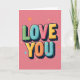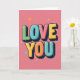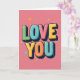 This card features the big words “LOVE YOU” stacked in two lines, with “LOVE” on top and “YOU” below, right in the center. Each letter looks chunky and 3D with dark outlines and soft shadows, set against a warm rosy pink background. The colors are mixed and cheerful: a green “L,” light blue “O,” bright pink “V,” and yellow “E,” then a yellow “Y,” orange “O,” and teal “U.” A light grainy texture runs across the whole design, giving it a slightly retro feel. Tiny white specks are scattered over the letters and background, like little bits of sparkle. Larger dots in orange, blue, yellow, and green float around too, making it feel like confetti is falling. It’s a simple, direct way to say what you feel, so it works for a partner, a close friend, or anyone you want to make feel loved 🥰❤️. Hope it helps you share your Valentine’s Day sentiments.