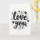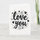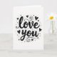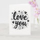 This card shows the words “love you” in black, drawn in thick, flowing letters that loop into each other across a bright white background. The phrase sits right in the center and fills most of the front, so your message is the first thing someone sees. Inside the black letter strokes, there’s a thin trail of little white dashes that looks a bit like stitching, adding a sweet, thoughtful detail. Around the words, small black hearts and tiny dots are scattered like confetti, making the space feel lively without being busy. A few curled flourishes stretch out from the lettering, giving the design a gentle, romantic finish. The simple black-and-white look keeps it direct and easy to read, while still feeling special and caring 🥰. It’s a meaningful card to give when you want to say “I love you” in a way that feels honest and close ❤️. Hope it helps you share your Valentine’s Day feelings with someone you care about.
