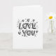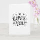 This card features a black-and-white design with the words “LOVE YOU” large in the center. The letters are thick and rounded, outlined in black with small shadowing that makes them look slightly raised on the white background. The “O” in both “LOVE” and “YOU” is replaced by a heart shape, so the message feels extra loving ❤️. Around the main words, small black hearts float like they’re circling the message, adding a sweet, friendly energy. Many of the hearts have tiny dot patterns inside them, giving the art a little texture and detail. Short black lines radiate from parts of the words and hearts, like little bursts that suggest excitement and affection. The text looks like casual hand lettering in black ink, placed right in the middle so it’s the first thing you notice. It’s a simple way to say what you feel, and it’s easy to share Valentine’s Day with someone you care about 🥰.