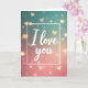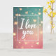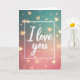 This greeting card centers on the simple message “I love you” in white, flowing cursive-style letters. The words sit inside a thin white rectangle, placed right in the middle of the front. Behind it, the background fades from teal-blue at the top to soft rose-pink at the bottom, like a gentle wash of color. Across the whole scene, small heart-shaped light spots glow in warm amber and pale gold, with a mix of sizes that makes the card feel alive. The hearts look softly out of focus, like cozy lights in the distance, and they add a calm, romantic mood 🥰. It feels meaningful because it says what you want to say without a lot of extra words, and the warm colors help the message land with care ❤️.