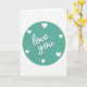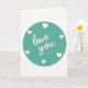 This card shows a muted teal circle centered on a white background, giving the front a calm, simple look. The words “Love you” sit in the middle of the circle in white, flowing handwritten-style letters. A faint shadow under the letters makes them look slightly raised, like gentle embossing. Around the words are six small white hearts, spaced in a loose ring, each with the same soft shadow so they seem to float. The cool teal and bright white contrast keeps the design easy to read and soothing to look at. It feels meaningful because it says what you want to say without a lot of extra fuss, which can be really sweet 🥰. Whether it’s for a partner or someone close, the hearts and soft depth make it feel like a quiet little hug ❤️. Hope it helps you share your Valentine’s Day feelings in a simple, caring way.