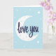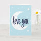 This card shows a white crescent moon tilted to the left, set against a soft sky-blue background. The moon has tiny pale-blue dots on it, giving it a gentle, speckled look. Around it, small white circle “stars” are scattered across the sky, along with two simple five-point stars. Near the center, the words “love you” appear in deep navy blue, written in a flowing, handwritten letter style with tiny white specks mixed in. The text sits right over the moon area, so the message feels like it’s floating in the night sky. The whole scene feels calm and close, like telling someone you care in a quiet moment 🥰. It’s a meaningful card to give when you want to say “I’m here” and “you matter” without a lot of extra words ❤️. Hope it helps you share your Valentine’s Day feelings in a simple, loving way.