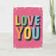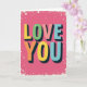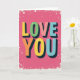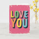 This greeting card features the words “LOVE YOU” in big, 3D-style letters on a bright fuchsia pink background. “LOVE” sits above “YOU,” centered on the front, so the message is the first thing you notice. Each letter is a different color—yellow, green, peach, orange, and light blue—with dark shadowing that makes the words look raised. Small white highlights on the edges add a shiny look, like the letters are glossy. The pink backdrop has tiny white specks scattered around, like confetti, which keeps it feeling fun and upbeat 🥰. A rough-looking white border frames the whole design and gives it a cozy, slightly retro feel. It’s a simple way to say what you mean without needing a long note, whether it’s for a partner or someone you care about ❤️. Hope it helps you share your Valentine’s Day feelings in a kind, easy way.
