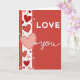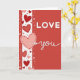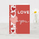 This card shows a deep red background sprinkled with tiny white dots, setting a cozy, love-filled scene ❤️. Along the left side, there’s a tall white strip filled with different heart shapes in red and pink, some with dashed stitch-like lines that make them feel extra sweet. One larger pink heart in that strip stands out, and a thin white arrow starts from it and stretches across the red area. The arrow points toward the message on the right, tying the picture and the words together in a simple, thoughtful way. Near the top right, the word “LOVE” appears in big white uppercase letters, easy to read and meant to stand out. Just below it, “you” is written in a smooth cursive style in white, softer and more personal next to the strong “LOVE.” It feels meaningful because the arrow makes it look like the love is being directed straight to the person you’re giving it to 🥰. Hope it helps you share Valentine’s Day sentiments with someone you care about.