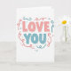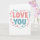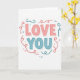 This card centers on the words “LOVE YOU” in big, rounded letters that feel friendly and easy to read. “LOVE” sits on top in soft coral pink, with “YOU” right beneath it in calm teal. The text is placed right in the middle of a white background, so the message is the first thing you notice. Each letter has a small shadow behind it, giving the words a little depth without looking busy. Around the lettering, thin curly lines and scattered dots in coral and teal loop and sprinkle like streamers or confetti. The overall look is bright but gentle, like a quiet way of saying what you feel 🥰. It’s a simple card that still feels meaningful, because the message is clear and the design adds a touch of celebration ❤️—perfect for sharing Valentine’s Day feelings with someone you care about.