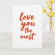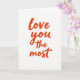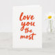 This card keeps things simple, with the words “love you the most” centered on a plain white background. The phrase is stacked in three lines, so your eyes move down the page as you read it. The letters look like they were painted with a brush, with slightly uneven edges and visible stroke marks that make it feel human and real. The color is a warm orange-red, like a soft red with a hint of orange, and it stands out strongly against the white. There aren’t any characters or extra objects—just the message—so all the focus stays on what you want to say. Because the design is so straightforward, it feels honest and easy to give to a partner, close friend, or anyone you care about 🥰. The text sits right in the middle, with a casual painted-letter look that feels intimate without trying too hard ❤️. It’s a sweet way to share Valentine’s Day feelings and let someone know they matter.