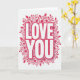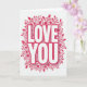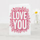 This greeting card centers on the words “LOVE YOU” in white capital letters, outlined in bright fuchsia, sitting right in the middle of a white background. A soft shadow behind the letters gives the message a gentle layered look without feeling busy. Around the text is a looping frame of leaves and tiny starburst flowers in deep pink, rose, and crimson, forming a full ring like a floral wreath. The leaves curve inward as if they’re giving the words a quiet hug, and the small blooms add little points of sparkle. The phrase is easy to read, and the strong contrast makes it feel direct and honest ❤️. With all that white space, the pink and red details stand out and keep the focus on what you want to say. It feels meaningful because it’s simple, warm, and says exactly what you might not always say out loud 🥰. Share it to pass along your Valentine’s Day feelings in a sweet, straightforward way.