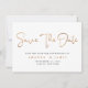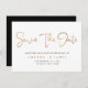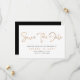 Modern minimalist cooper gold script save the date card. This elegant card features of handwritten script in cooper gold color on white background and wedding details and names written in capital lettering in black color. Back of the card is deep black. To edit this template click customize further.
