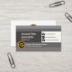 Card features a grey monochromatic cover. The white column at the right wall houses all the contact details with your prestigious name and job title over on the left. Directly underneath is a gold logo which you may use alongside its business name and a slogan to advertise your service.