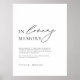 Remember and honor loved ones who have passed away on your special day with this beautiful In Loving Memory Wedding Sign. Featuring a simple and elegant design with the text "In Loving Memory OF" in a clean and stylish font, this sign is the perfect addition to any wedding ceremony or reception. The minimalist design will complement any wedding decor, and the sign is customizable. To personalize, simply click "Personalize" and enter your details. This sign is a wonderful way to keep the memory of your loved ones close on your special day. Take a look at the rest of the collection to see all the matching items available in this beautiful design.