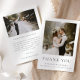 A simple, modern wedding thank you card featuring a custom vertical photo on the front and a horizontal photo on the reverse. The words "Thank You" appear in classic charcoal gray serif font. Add your names and the date and location of the wedding below. Personalize the reverse side with a message of your choice. Easily replace the sample images with your own wedding photos.