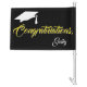 Simple and Modern Black Congratulations Graduation Car Flag with a Graduate Name. The design has a white graduation cap, modern typography text Congratulations and the name of the graduate in golden and white colors - personalize with your name.