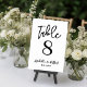 This custom table number sign features a simple black and white design with a clean white background and crisp black fonts for a timeless look. A mix of handwritten script and classic serif fonts creates an elegant and balanced style. The design includes the table number, along with the bride and groom’s names and wedding date.