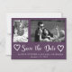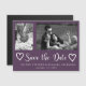 Modern purple brush script fancy save the date wedding with 2 photos collage - one vertical / portrait oriented and the other horizontal / landscape and two doddle hearts. ++++++++++++++ Personalize it with your photos, names and wedding date!