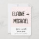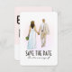 A simple, modern save the date design. Front side has the illustration of a bride and groom walking hand in hand along with "save the date" announcement. Back side of the design follows the colour theme of pink, browns and white. It has the bride and groom's name in big bold letters on the top. And on the bottom, the date and the location details follow.