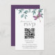 This simple modern garden greenery wedding RSVP card with QR code features a watercolor dragonfly in shades of purple and pink. It is resting on a simple arrangement of natural watercolor garden greenery on a white background. The back is a solid deep purple that matches the dragonfly. Just add your wedding website URL, so your guests can scan the QR Code and easily respond.