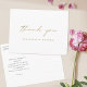 Check our flat thank you card collection and folded thank you card collection for versions of this postcard in other formats! This simply elegant wedding thank you postcard features 'thank you' in a chic modern script. This element of the design cannot be altered. You can change the color or font or size of any of the other text. We've chosen a chic tone sometimes called California Gold as the default for the names text on the front and the default color of the text on the back is a gray tone. We've put some sample text on the back for you to replace with your message. But please don't feel restricted by this. If you prefer to make the back blank so that you can write a handwritten note on each card instead, you can do that. Just please be sure in any case to delete our sample text! We have not picked a default color for the background on either side. Instead, the default is set as transparent to let the color of the paper simply serve as the base tone. You can change this by picking a color in the editing tools if you'd like for one or both sides. A minimalist design like this puts the paper in a sharper focus and invites you to add your own handwritten words on back, whether it's your signatures or a message as well. We've chosen matte rather than semi-gloss as the default paper choice, as it is well suited to writing your own message on and won't smudge. But you can change this according to your style. Use the intuitive editing tools and make this simply stylish modern gold wedding thank you postcard uniquely yours with the intuitive design tools and your inspiration!