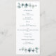 A chic and modern program card is framed with minimalist eucalyptus branches. The back lists the wedding party against a rich green background.