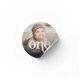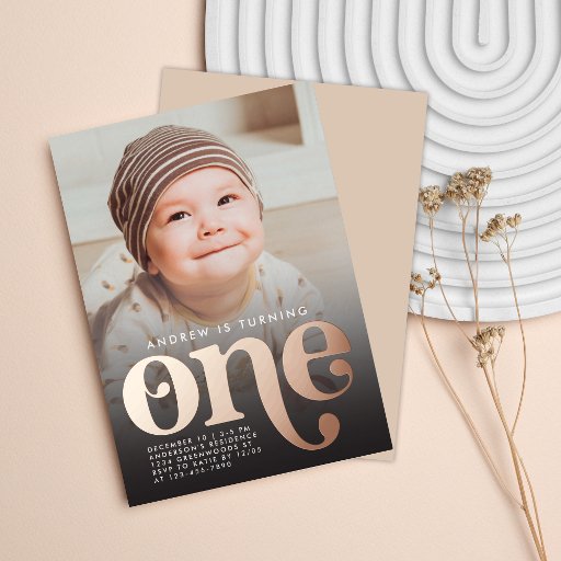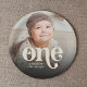 A modern and minimalist first birthday photo balloon featuring a boho and bohemian retro style typography of "One" in the bottom center and a cute photo of your baby. Personalize the name and picture.