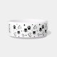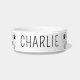 A simple yet cute ceramic dog bowl with watercolor hearts on each side of your dogs name .