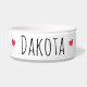 A simple yet cute ceramic dog bowl with watercolor hearts on each side of your dogs name .