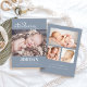 This simple modern photo collage birth announcement card is perfect for sharing the good news of the arrival of your baby. It features a single photo on the front side with a modern heart script with the word "introducing" on a dusty blue background. The backs side features a three photo collage. Add your baby's name and birth stats to personalize the card.