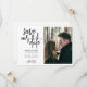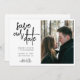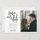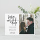 Minimalistic engagement photo wedding save the date in simple black and clear white with a modern whimsical handwritten calligraphy script. +++++++++++ Suitable for spring summer autumn fall or winter stylish modern theme weddings.