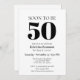 This simple yet modern surprise 50th birthday invitation is designed with elegance and fun in mind. A bold “50” in classic serif font takes center stage, with “soon to be” above and “join us to celebrate” with the honoree’s name below, finished with the phrase “but keep it a secret.” The back keeps the mystery alive with “hush, hush, it’s a surprise” framed by playful confetti. Set on a crisp white background with black lettering, the design is easy to personalize with all your party details for a polished look.