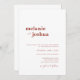 This simple, modern wedding invitation features a terracotta and white color palette, a bold serif font for the couples' names, an elegant and classy sans serif font for the wedding invitation text, and a charming hand-written script font for a touch of extra elegance.