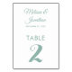 Simple and elegant minimalist wedding table number card featuring a stylish mint green script over a classic white background. Easily customizable with the bride and groom's names, the wedding date, and the table number.