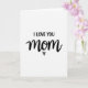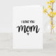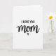 This card features a bright white background with two centered lines of dark text that feel direct and affectionate, like a close hug in words ❤️. The top line reads “I LOVE YOU” in thick, simple letters that stand out sharply against the pale space. Beneath it, “mom” appears larger in a flowing cursive style, with rounded strokes that suggest a tender, familiar tone between parent and child 👩. The layout stays uncluttered, letting the strong contrast do most of the talking while leaving plenty of breathing room around the message. Both lines are aligned in the middle, with the upper phrase sitting slightly above center and the lower word taking up more visual weight below. The lettering is black or very dark gray, keeping the focus on the message rather than extra decoration. Just under the word “mom,” a small, loosely drawn heart sits slightly off-center, outlined in the same dark ink.
