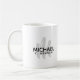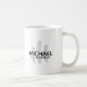 A white mug of coffee personalized with your (or someone special) first and last name with a script initial at the back.