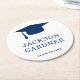 Classic graduation paper coaster featuring a simple and minimalist design with a grad cap along with the graduate's name and class year in bold navy blue over a white background. A traditional design with a masculine touch perfect for a boy graduate. These paper coasters are a great way to add a personal touch to your graduation party.