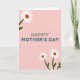 This greeting card features a soft pastel pink background that feels gentle and welcoming, with a calm, affectionate tone ❤️. Centered on the front, the words “HAPPY MOTHER’S DAY” are stacked in two lines, with “HAPPY” in a light gray and “MOTHER’S DAY” in a deeper blue-gray that draws the eye. The simple lettering sits in the open space like a quiet hug, leaving room for the surrounding florals to feel like a caring frame. In the upper left corner, a single daisy-like flower leans inward, as if turning its face toward the message. At the lower right, two more matching blooms gather close together, suggesting a sweet closeness like family or friends sharing a moment 🌼. A small hint of another flower appears near the lower left, balancing the layout without crowding it. The flowers have white petals with warm orange centers, and their thin green stems and small leaves arc lightly along the edges.