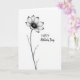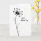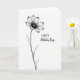 This card features a monochrome drawing of a single flower, set against a wide white background that feels calm and open. The blossom has many thin petals that spread outward like a gentle hug, with fine parallel lines that add soft texture and depth. Near the center, the shading grows darker and denser, drawing your eye inward like a quiet, affectionate glance ❤️. A long, slender stem curves downward with a few small budding shapes along it, giving the scene a living, growing feel. To the side of the flower, the word “HAPPY” sits in uppercase letters in a simple sans-serif style, colored in dark charcoal. Directly below, “Mother’s Day” appears in a flowing calligraphic style in the same dark tone, creating a tender contrast between the two lines 🌼. The petals fan outward in charcoal ink, while the background remains bright white with plenty of open space around the flower.