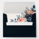This is an elegant navy blue wedding envelope with a light blue and navy blue watercolor flowers design on the interior flap on a blush background. It is perfect for a romantic floral wedding celebration.