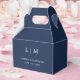Simple yet elegant Wedding Favor Box featuring a modern minimalist design with your two letter monogram along with your names and date. All design elements are in white over a navy blue background and may be changed in the design editing tool. These classic Wedding Favor Boxes go well with any style of wedding.