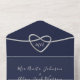 Experience understated elegance with our modern navy blue all-in-one wedding invitation. Adorned with a silver rope heart featuring the monogram initials of the bride and groom, and complemented by simple calligraphy script, this invitation exudes sophistication. Personalize it with a custom photo of the couple at the back and include a QR code for seamless RSVP and access to your wedding website. Set the stage for your special day with this sleek and stylish design, where every detail reflects the beauty of your love story.