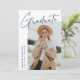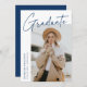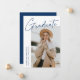 Modern graduation announcement card featuring one of the graduate's photos on the front with "Graduate" in a navy blue handwritten script with a white background. Personalize with the graduate's name, school name, and graduation year. The minimalist graduation announcement reverses to display 4 photos in a grid-style layout with the graduate's future plans or other custom text shown below. The 5 photo graduation announcement is perfect for both high school and college graduates.