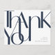 The simple 5.6" x 4.25" wedding pre-addressed thank you postcards feature the words, "Thank you," in large navy blue script letters on a white background with placeholders for the sender's return address along with the recipient's return address.