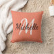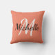 Throw pillow with a salmon orange background and white simple monogram first initial and first name.