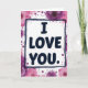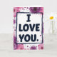 This card features a white rectangle in the center with the words “I LOVE YOU.” printed in dark, all-caps letters that look like a simple sans-serif style. A slightly uneven indigo outline frames that white panel, giving it a drawn-by-hand look. Around the edges, bright pink and magenta flowers spread out like daisies, with detailed petals and darker centers. Purple and fuchsia paint splatters and ink spots are scattered between the flowers, making the background feel lively and full. The strong message in the middle feels steady and certain, while the surrounding colors feel like an emotional burst of love. It’s meaningful to give because it says exactly what you feel, and the flowers add warmth and care without needing extra words 🥰. Share it to pass along a little Valentine’s Day love and kindness ❤️.
