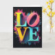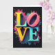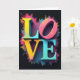 This greeting card shows the word “LOVE” in big 3D letters set against a deep black background. The letters are stacked in two lines, with “LO” on top and “VE” underneath, so your eye moves through it easily. The “L” and “V” are bright yellow, the “O” is pink, and the “E” is aqua-teal, making each letter stand out on its own. The lettering has a slightly worn, brush-painted look, which makes it feel more human and real. Behind the letters, clouds of colored powder burst outward in pink, blue, and golden tones, like a small celebration frozen in time. The shadows and highlights give the letters depth, so the word feels like it’s floating forward from the dark space. It’s a meaningful card to give because it says “LOVE” plainly while still feeling full of warmth and energy 🥰❤️. Hope it helps you share Valentine’s Day sentiments with someone you care about.