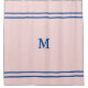 This pale pink shower curtain has two deep blue horizontal lines are across the top and bottom. A deep blue letter is in the center. You can change the letter to display the correct monogram.