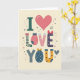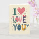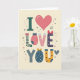 This card shows the words “I LOVE YOU” spread across the front in big, easy-to-read letters. The “I” is a deep teal, and the “Y” is a muted gray, framing the message like two steady bookends. In the middle, the “O” in “LOVE” is replaced with a large soft pink heart, which makes the whole message feel extra caring 🥰. Several letters look like cozy clothing pieces, like a long striped sock shaping the “L,” and other letters that resemble mittens and cuffs with simple patterns. The second “O” in “YOU” is a rounded dark blue shape with polka dots, topped with a small yellow bow that adds a sweet, friendly touch. The background is creamy beige with small scattered hearts and starburst shapes in gentle pastel colors like pink, yellow, blue, and purple. It feels meaningful to give because it turns “I LOVE YOU” into something warm and comforting, like a little hug on paper ❤️. Hope it helps you share your Valentine’s Day sentiments.