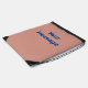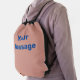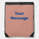 This peach drawstring backpack has blue display text. You can edit the text to show a personalized message.