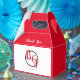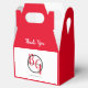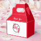 This design features an elegant yet simple arrangement of the bride's and groom's personalized initials. The couples names are encircled with a black ring and placed on top of the bride's and groom's first name initials which are displayed in red color typography. This red, black and white design is simple yet elegant in every way. The combination of colors creates a sophisticated, trendy and chic style. Elegant wedding favor box design with modern elements. The simple setup of the typography gives it a distinct style. Matching wedding invitations and other stationery items are also available.