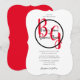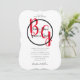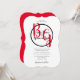 This design features an elegant yet simple arrangement of the bride's and groom's personalized initials. The couples names are encircled with a black ring and placed on top of the bride's and groom's first name initials which are displayed in red color typography. This red, black and white design is simple yet elegant in every way. The reverse displays a red color background. The combination of colors creates a sophisticated, trendy and chic style. Elegant wedding invitation design with modern elements. The simple setup of the typography gives it a distinct style. Matching wedding stationery items and other wedding invite formats are also available.