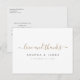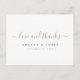 This simply chic wedding thank you postcard template features a crisp modern look. We've given this minimalist design a splash of panache with 'love and thanks' in a flowing modern font that manages to be both elegant and lively at the same time. We love the stylized, elongated flourish at both ends. To highlight this aspect of the design we've chosen an elegant gold tone sometimes called California Gold for the 'love and thanks' part of the design. You can easily edit the text to suit your taste, and you can change the font and color of the text as well. You might for example chose another format for your names, such as 'Mr. and Mrs......' or your first names and last name, etc. or give a different color to the 'love and thanks' script. We've chosen black and gray as the default setting for the other text on the front, and a gray tone for the text on the back. We've put some sample text on the back for you to replace with your own message as you see fit. But please don't feel restricted by this. If you prefer delete our sample text and then keep the message space on the back totally blank so that you can write a handwritten note on each card instead, you can do that. Or you might want to replace our text with your own message of gratitude and your own closing and then hand sign your names when you receive the cards. Just please be sure in any case to delete our sample/placeholder text on both sides of the card! The default background on the front is transparent so that the color of the paper will simply serve as the base tone. On the back we've chosen a background hue that isn't quite white, it's a very light gray that's mostly white called White Smoke. You can change this by picking another color in the editing tools, or perhaps you'd like to make it transparent as it is on the front. We hope you'll enjoy experimenting with various aspects of this thank you postcard's appearance according to your taste and make it uniquely yours with the intuitive design tools and your inspiration. And please browse our wedding thank you collection for a selection of elegant modern wedding thank you cards!